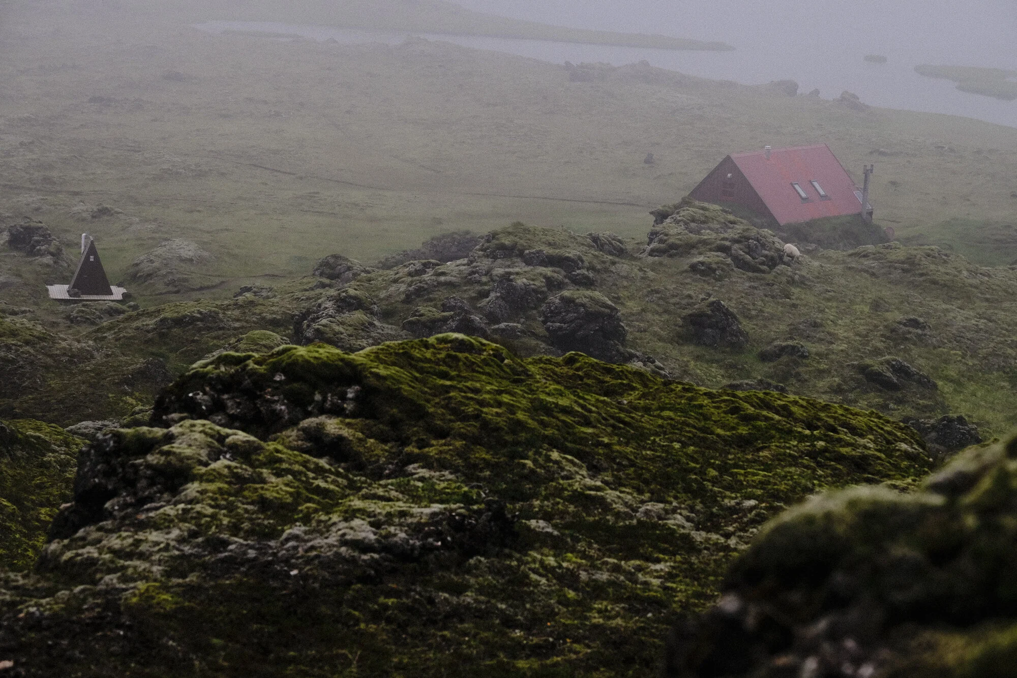 For a moment it felt like a scene from The Goonies, where we were about to be discovering something mystical. A lore had been built up about this place, as we pedaled for hours through adverse elements to find it. We were told to follow the sign to what would like like a dead end. Just as the road ends we were supposed to follow the sheep trails through rock crevasses and just trust that they would lead us to “the place.” Sure enough, we found the sheep trails and pushed our bikes over huge rocks, around sheep dung, and through some very narrow passages. My rational brain was asking me what the hell I was doing, then I looked up and right before my eyes was a fictional scene of beauty. A hut with a small a-frame outhouse was waiting for us at the bottom of the moss covered valley. Unreal. Would there be any trolls or Huldufólk down there?